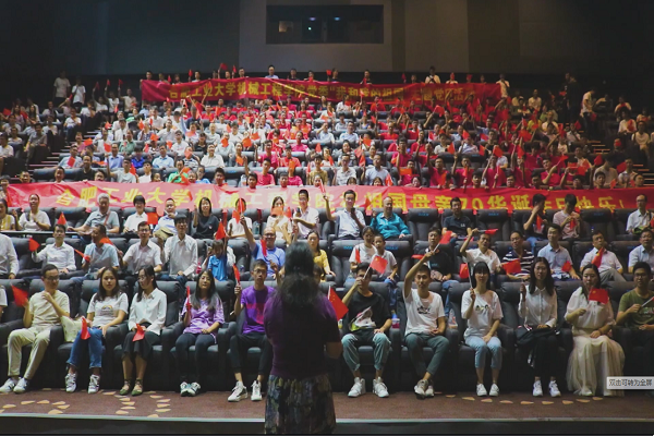 随后,学院党委组织党员开展了《我和我的祖国》观影活动,学生党员身着红色文化衫在座位上组成了“70”的图案,献礼祝福告白祖国。《我和我的祖国》整部电影从《前夜》、《相遇》、《夺冠》、《回归》、《北京你好》、《白昼流星》、《护航》等七个故事构成,影片聚焦了1949年开国大典,母亲诞辰后,当普通的中国人与国家大事件相遇在一起,碰撞出来的能量,凝结着不平凡的中国人民,用真心、用实情、用光影讲述的每一个我和祖国的故事,他们用温暖、用情感,把我和我的祖国连接了起来,让我们感到了祖国的强大,感受到了祖国的温度,回顾这70年峥嵘岁月,每个艰苦奋斗、平凡而伟大的中国人民与祖国息息相关的共同记忆,为大家搭起了解祖国历史进程的纽带。